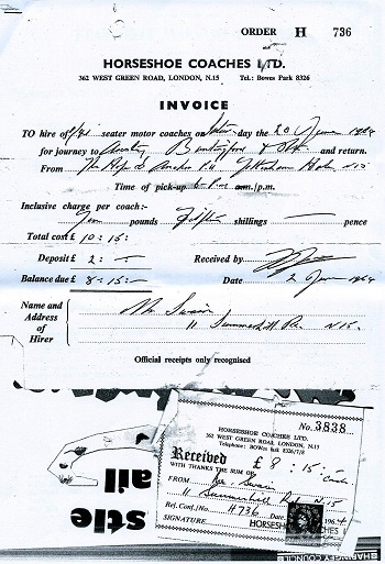 I can also recall on an excursion to Ramsgate with my father, there was what we now know as a mock-auction taking place along the sea-front. Despite his protests, we persuaded him to go inside and then bidding for a travel holdall, which was being offered for a ridiculously low price. Needless to say the final price was nothing like the one offered and we ended up with a holdall we had no real need for. He never let us forget that lesson ! On another occasion we went to Clacton-on-Sea and plagued our parents to allow us to play Crazy Golf. With an over ambitious and violent swing, my brother Ray hit me right above the eye and cut my forehead open. I was promptly marched to the nearest St John's Ambulance station and had my head swathed in bandages. I had to return home in the coach under the gaze of all our fellow passengers. I am a very keen Golfer today but, with that early introduction to the game, I often wondered why that should be. Other 'Horseshoe' memories include night-time excursions to see the illuminations at Southend-on-Sea and a school trip to Whipsnade Zoo in Bedfordshire. There was also a weekly service from School to the Municipal Baths at Tottenham green. I can also recall that my father would book Horseshoe Coaches when organising pub outings from the 'Hope & Anchor', which was situated at Tottenham Hale. |