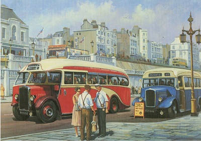 Of the many different coach types and styles operated by Horseshoe coaches, my personal favourite was the small Bedford coach, which had elegant lines, coupled by a simple charm. I can recall receiving a small 'Dinky' toy replica of the Bedford Coach as a Christmas present, and was very upset when it mysteriously disappeared. I have reason to believe that somehow, with a little help from my brother Ray, it found it's way into a hole in the roots of the large tree at number 23 Summerhill Road. Come on Ray it's now over 45 years ago...It's time to own up ! Many of my best memories of Horseshoe Coaches however were the frequent coach excursions we would take to seaside resorts. These were great adventures in post-war Tottenham and the only opportunity to travel outside of London. Living opposite the coach station, I am sure my mother would hear of spare seats at the last-minute. Whether she benefited by reduced prices I don't know. I can remember visiting Brighton, Hastings, Eastbourne, Ramsgate, Margate, Clacton and Southend-on-Sea and I suspect I have forgotten a few others. I have vivid memories of our many visits to Brighton, which were always welcomed with great enthusiasm. From late afternoon there would be a line of coaches right along the sea-front stretching from the Palace Pier to Black Rock. We would then walk along the line searching for our 'Horseshoe' coach. To complicate matters, there was sometimes more than one 'Horseshoe' coach so it was important you boarded the correct one. Hopefully, by the time the coach had crept along to the head of the line at Palace Pier, all of the passengers had boarded. If not there would be a frustrating time waiting for the stragglers to appear. |