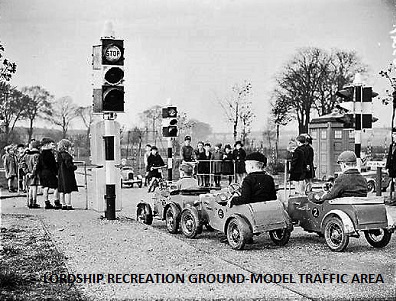 that was published in 'Weekly Illustrated' in August 1938: (Click here -Newspaper feature) You could hire a model car or bicycle to ride around the mini-road system. Alternatively, on payment of a small fee, you could use your own cycle. There were also various pieces of play equipment sited within the landscaped areas of the road system, so that children were forced to cross the roads and thus encouraging road safety training There were miniature traffic lights, pedestrian crossings, roundabouts and even a miniature police call box. The Model Traffic Area has been described as a unique example of a pioneering education facility and much loved by those who had the privilege to use it as children. |
