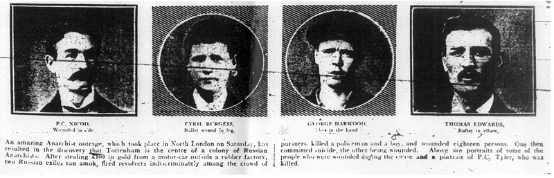 The Tottenham Outrage is perhaps one of the most famous incidents in Tottenham's History, which at the time was of widespread public interest at both local and national levels. The 'Outrage' occurred in Tottenham on 23rd January 1909 and involved 2 Bolsheviks of Russian origin who had attempted an armed robbery of Schnurmann's Rubber Company in Chestnut Road Tottenham. Not a very smart move you might think since it was situated in the shadow of Tottenham Police Station. In their attempts to get away the two robbers, Paul Hefeld and Jacob Lapidus, started a chase and shooting spree that resulted in two deaths -PC William Tyler and a 10 year old boy named Ralph Joscelyne. The chase started in Chestnut Road and involved a variety of commandeered transport - Cars, Horse & cart and even a Tram. The chase continued through Tottenham Marshes across the River Lea then through the Reservoirs to Walthamstow. The chase continued on to Chingford where Jacob Lapidus shot himself through the head rather than be captured. Paul Hefeld finally took refuge in 'Oak Cottage' at Hale End Chingford when, following a shoot out with the Police, he was overpowered and captured. However he had sustained head injuries and died several days later in the Prince of Wales Hospital in Tottenham. |