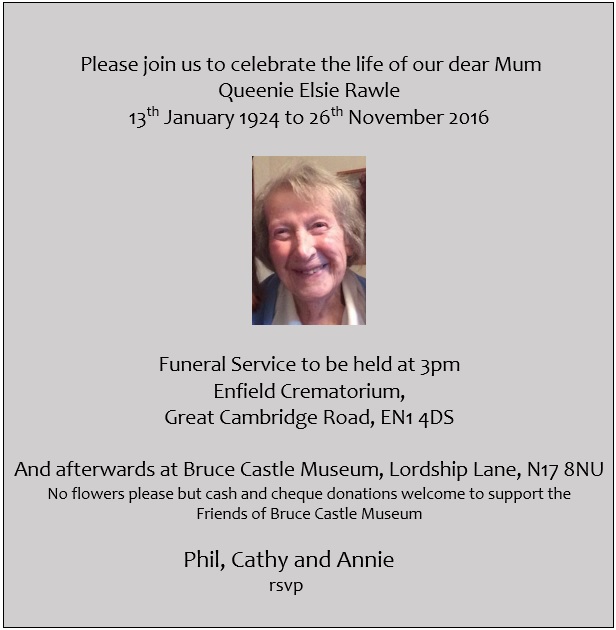 death of Queenie Rawle who died on the 26th November, 2016 aged 92
