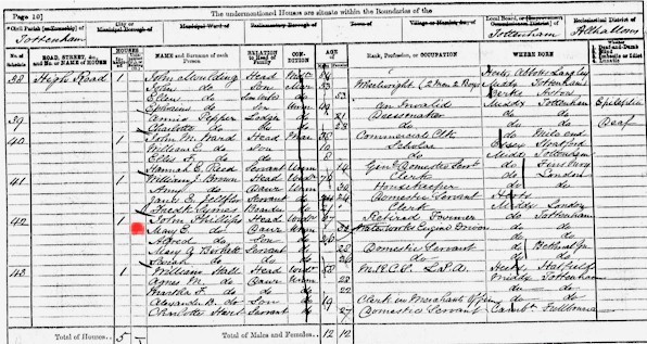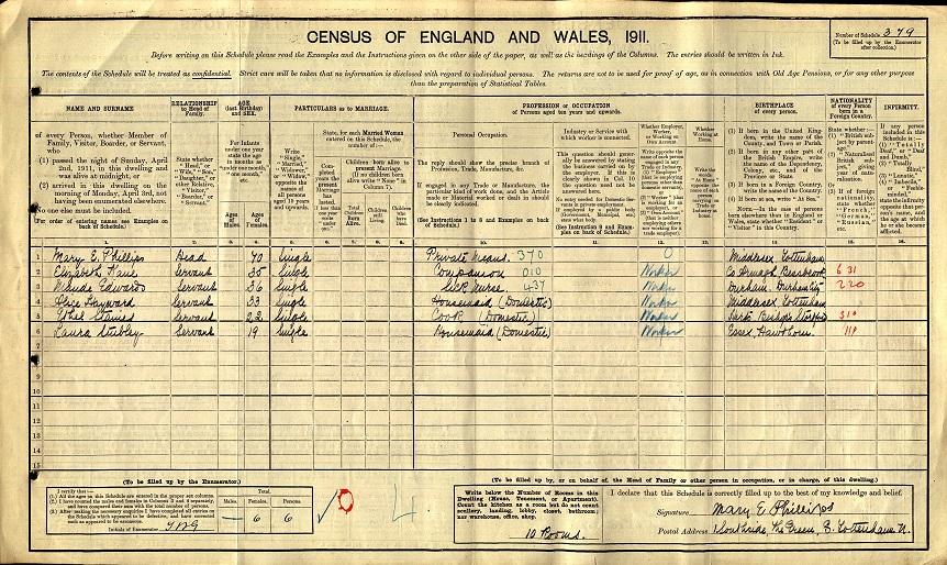 GREEN ( Mary E Phillips -aged 70 Years) Mary was now living with a companion and 4 servants at Tottenham Green. This census would have been completed by Mary as the Householder and, in all probability, this was her original handwriting. |